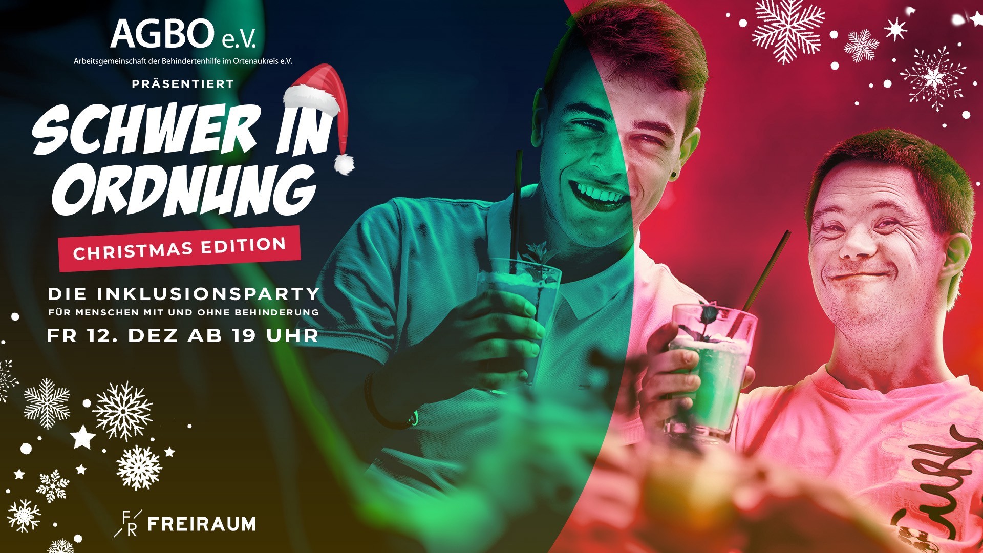 auch in diesem Jahr veranstaltet die Arbeitsgemeinschaft der Behindertenhilfe im Ortenaukreis e.V. (AGBO e.V.) wieder die beliebte Inklusionsparty „Schwer in Ordnung – Christmas Edition“ für Menschen mit und ohne Behinderung.