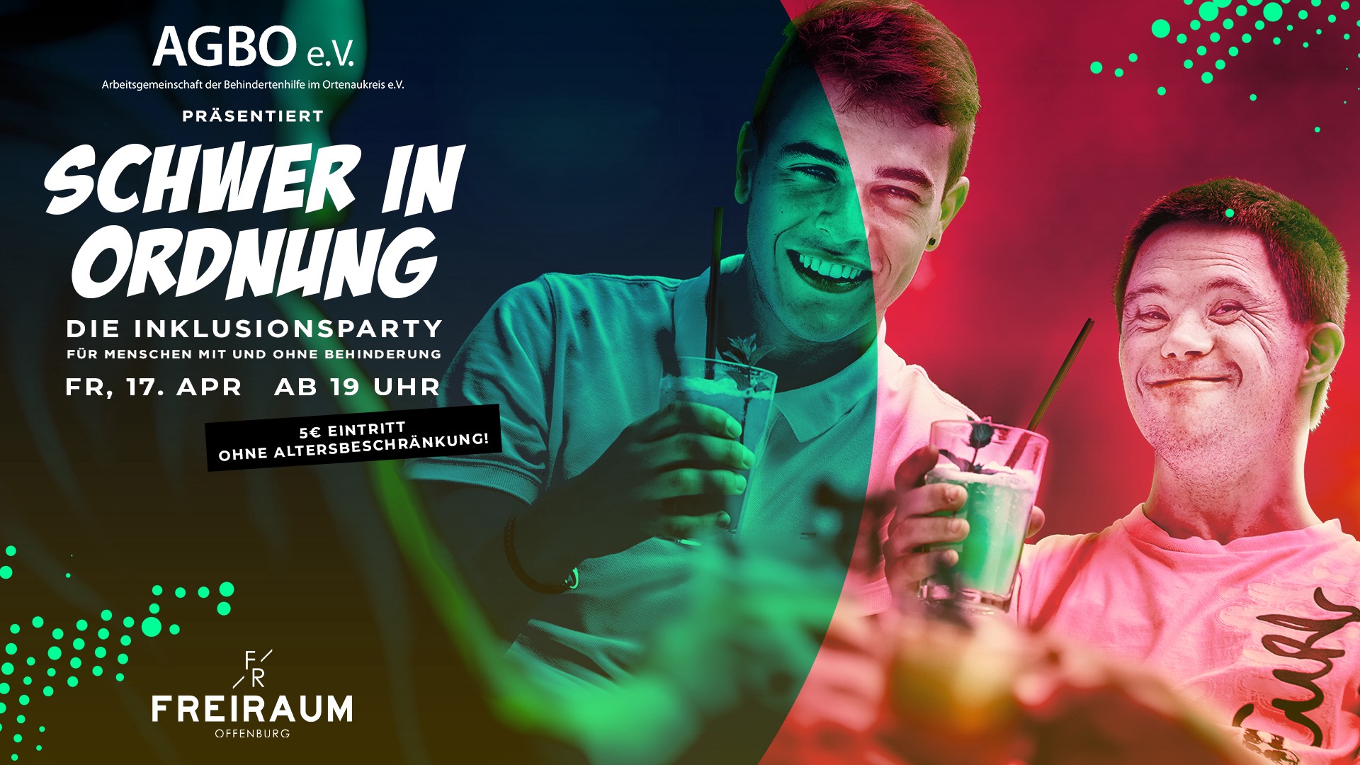 Die Arbeitsgemeinschaft der Behindertenhilfe im Ortenaukreis e.V. (AGBO e.V.) veranstaltet die nächste Inklusionsparty am Freitag, 17.04.2026 ab 19 Uhr im Offenburger Club „Freiraum“. Die Räumlichkeiten sind barrierefrei, Parkmöglichkeiten sind vorhanden.